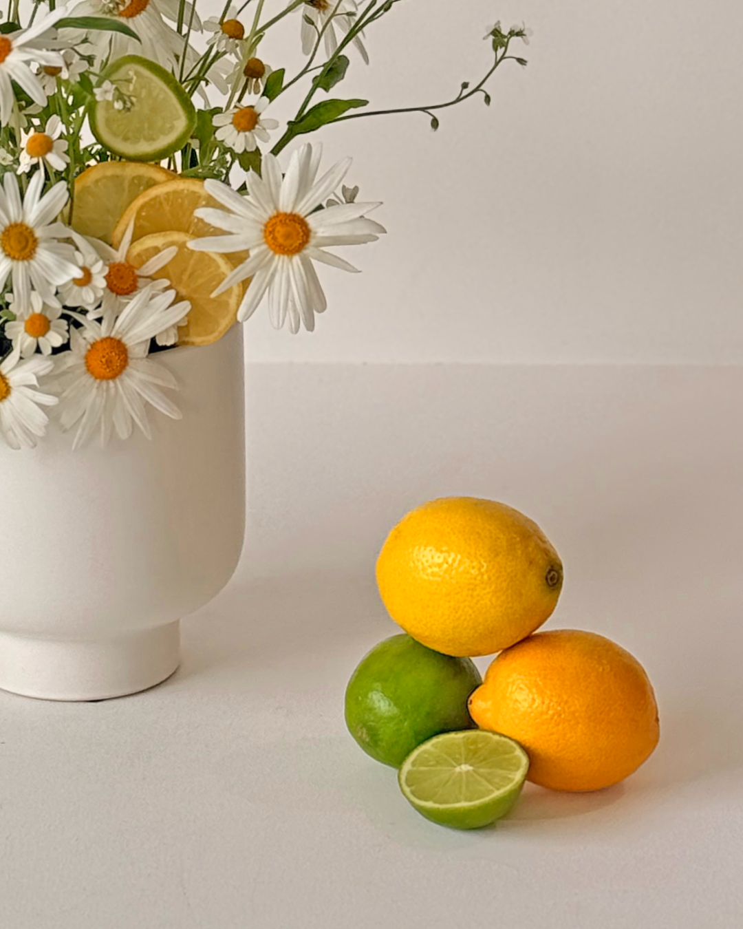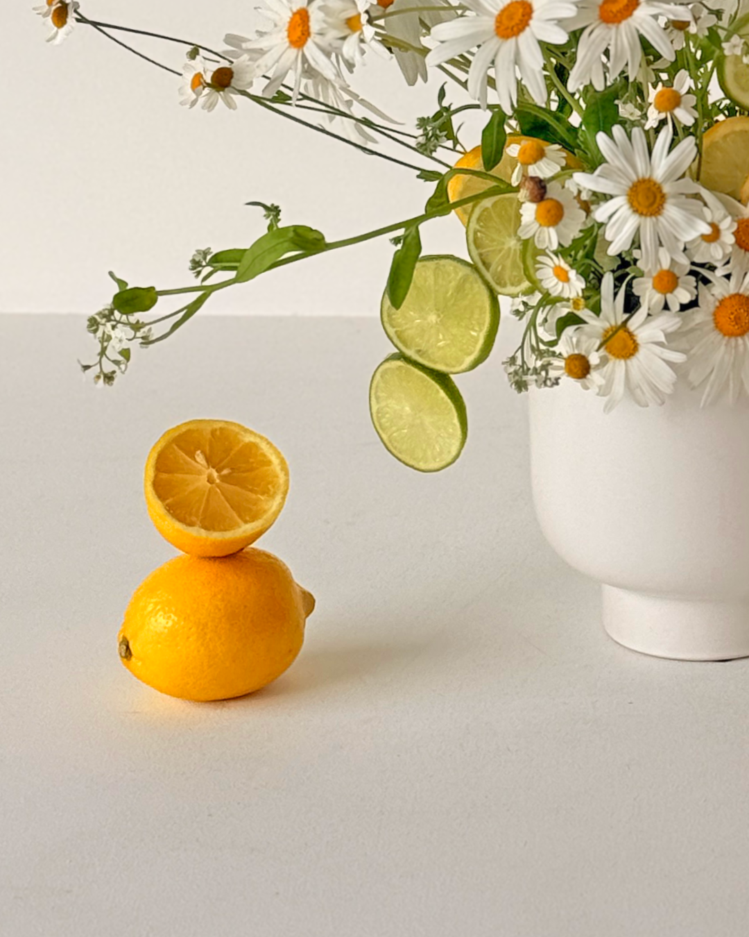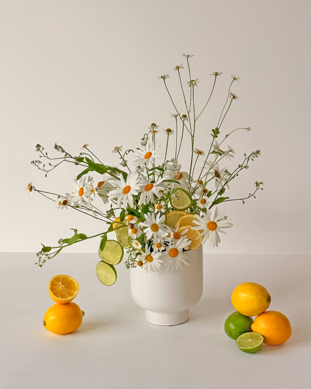 Take it further by wiring sliced lemons and limes directly into arrangements. Thread floral wire through citrus slices and secure them among delicate blooms like chamomile, forget-me-nots, and field daisies.