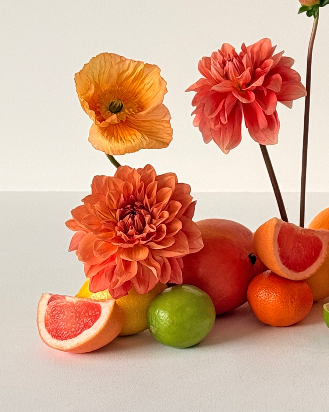 One of our favourite techniques? Using citrus as both vessel and design element. Hollowed-out grapefruits and blood oranges become natural containers for bold blooms like dahlias and poppies, their vibrant orange-red petals echoing the fruit's warm tones.